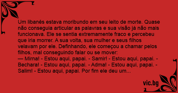 Um libanês estava moribundo em seu leito de morte. Quase não conseguia articular as palavras e sua visão já não mais funcionava. Ele se sentia extremamente fraco e percebeu que iria morrer. A sua volta, sua mulher e seus filhos velavam por ele. Definhando, ele começou a chamar pelos filhos, mal conseguindo falar ou se mover: