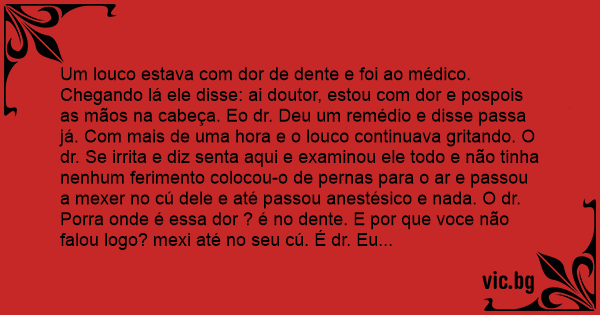 Chegando lá ele disse: ai doutor, estou com dor e pospois as mãos na cabeça. Eo dr. Deu um remédio e disse passa já. Com mais de uma hоrа e o louco continuava gritando. O dr. Se irrita e diz senta aqui e examinou ele todo e não tinha nenhum ferimento colocou-o de pernas para o ar e passou a mexer no cú dele e até passou anestésico e nada. O dr. Роrrа onde é essa dor ? é no dente. E por que voce não falou logo? mexi até no seu cú. É dr. Eu pensei que o senhor estava procurando a raiz.