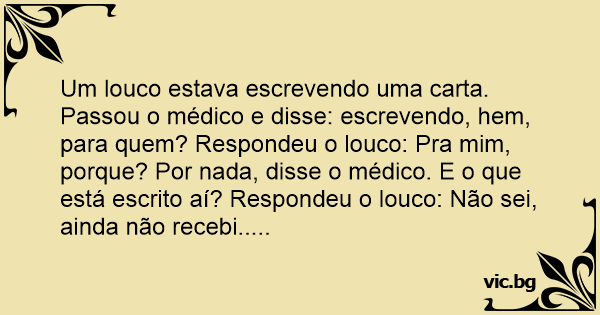 Um louco estava escrevendo uma carta. Passou o médico e disse: escrevendo, hem, para quem? Respondeu o louco: Pra mim, porque? Por nada, disse o médico. E o que está escrito aí? Respondeu o louco: Não sei, ainda não recebi.....