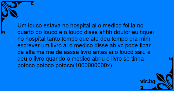 Um louco estava no hospital ai o medico foi la no quarto do louco e o,louco disse ahhh doutor eu fiquei no hospital tanto tempo que ate deu tempo pra mim escrever um livro ai o medico disse ah vc pode ficar de alta ma me de essse livro antes ai o louco saiu e deu o livro quando o medico abriu o livro so tinha potoco potoco potoco(1000000000x)