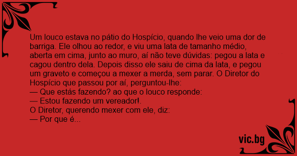 Um louco estava no pátio do Hospício, quando lhe veio uma dor de barriga. Ele olhou ao redor, e viu uma lata de tamanho médio, aberta em cima, junto ao muro, aí não teve dúvidas: pegou a lata e cagou dentro dela. Depois disso ele saiu de cima da lata, e pegou um graveto e começou a mexer a меrdа, sem parar. O Diretor do Hospício que passou por aí, perguntou-lhe: