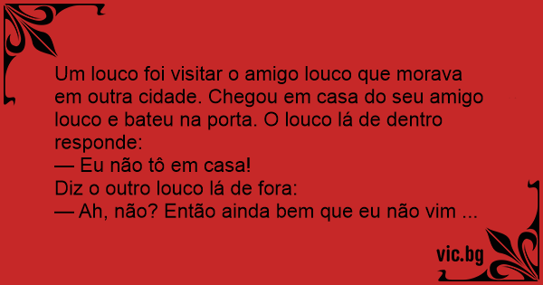 Um louco foi visitar o amigo louco que morava em outra cidade. Chegou em casa do seu amigo louco e bateu na porta. O louco lá de dentro responde: