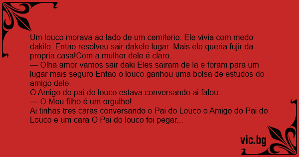 Um louco morava ao lado de um cemiterio. Ele vivia com medo dakilo. Entao resolveu sair dakele lugar. Mais ele queria fujir da propria casa!Com a mulher dele é claro. — Olha amor vamos sair daki Eles sairam de la e foram para um lugar mais seguro Entao o louco ganhou uma bolsa de estudos do amigo dele. O Amigo do pai do louco estava conversando ai falou. — O Meu filho é um orgulho! Ai tinhas tres caras conversando o Pai do Louco o Amigo do Pai do Louco e um cara O Pai do louco foi pegar uns drinks. Ai o Amigo do Pai do Loko - Meu filho deu uma bolsa de estudos para uma faculdade carissima! O Pai do Loko voltou - Eae qual assunto? — Orgulho de nossos filhos - Aé entao meu filho ganhou uma bolsa de estudos de воiоlа. O Louco foi pro hospicio porque nao tinha condições. Ai o diretor Fez uma porta numa parede DE LAPIS e falou - Ta livre!!!! Uma correria so! So o Louco do Cemiterio ficou. Ai o Diretor - Voce pode sair! Arrumando suas malas ele fala para o amigo - Nao conta pra ninguem que eu tava com chave da porta!