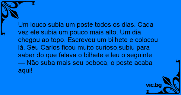 Um louco subia um poste todos os dias. Cada vez ele subia um pouco mais alto. Um dia chegou ao topo. Escreveu um bilhete e colocou lá. Seu Carlos ficou muito curioso,subiu para saber do que falava o bilhete e leu o seguinte:
