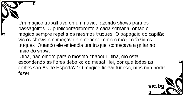 Um mágico trabalhava emum navio, fazendo shows para os passageiros. O públicoeradiferente a cada semana, então o mágico sempre repetia os mesmos truques. O papagaio do capitão via os shows e começava a entender como o mágico fazia os truques. Quando ele entendia um truque, começava a gritar no meio do show: