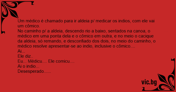 No caminho p/ a aldeia, descendo rio a baixo, sentados na canoa, o médico em uma ponta dela e o cômico em outra, e no meio o cacique da aldeia, só remando, e desconfiado dos dois, no meio do caminho, o médico resolve apresentar-se ao indio, inclusive o cômico....