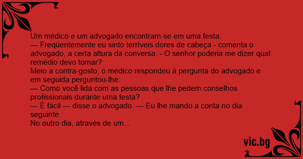 — Freqüentemente eu sinto terríveis dores de cabeça - comenta o advogado, a certa altura da conversa. - O senhor poderia me dizer qual remédio devo tomar?