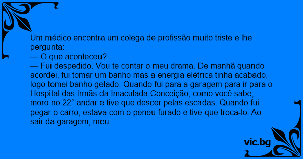 — Fui despedido. Vou te contar o meu drama. De manhã quando acordei, fui tomar um banho mas a energia elétrica tinha acabado, logo tomei banho gelado. Quando fui para a garagem para ir para o Hospital das Irmãs da Imaculada Conceição, como você sabe, moro no 22° andar e tive que descer pelas escadas. Quando fui pegar o carro, estava com o peneu furado e tive que troca-lo. Ao sair da garagem, meu vizinho bateu no meu carro zerinho. Para chegar ao hospital, foi um sufoco, pois sem energia elétrica os semáforos não funcionavam. Depois de quase duas horas conseguí chegar, mas tive que subir até o meu consultório pelas escadas, e você sabe que é no 17° andar, pois a energia ainda não tinha voltado. Quando conseguí chegar e sentar na minha cadeira, todo suado, cansado e louco da vida, pois estava atrazado para fazer uma operação importantíssima, me entra no consultório a Irmã Dulce com um supositório na mão e me pergunta: