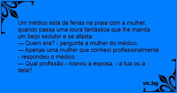 Um médico está de férias na praia com a mulher, quando passa uma loura fantástica que lhe manda um beijo sedutor e se afasta.
