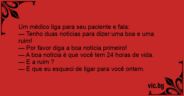 O médico liga para o paciente. — Alfredo, seus exames ficaram prontos. — E aí, doutor? Tudo bem? — Bem nada, rapaz! Tenho duas notícias para te dar: uma ruim e uma péssima. — Diz logo, qual a ruim?...
