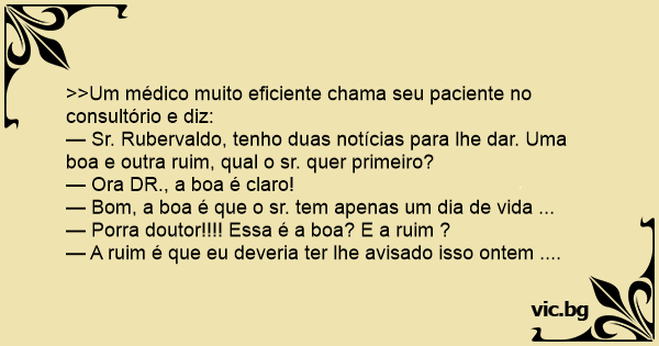 — Sr. Rubervaldo, tenho duas notícias para lhe dar. Uma boa e outra ruim, qual o sr. quer primeiro?