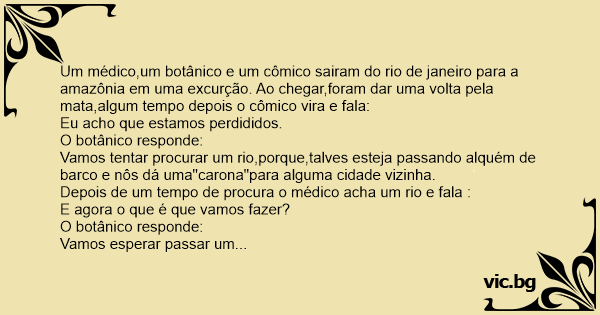 Um médico,um botânico e um cômico sairam do rio de janeiro para a amazônia em uma excurção. Ao chegar,foram dar uma volta pela mata,algum tempo depois o cômico vira e fala: