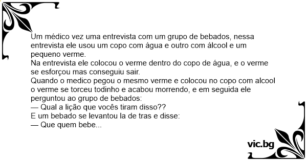 Quando o medico pegou o mesmo verme e colocou no copo com alcool o verme se torceu todinho e acabou morrendo, e em seguida ele perguntou ao grupo de bebados: