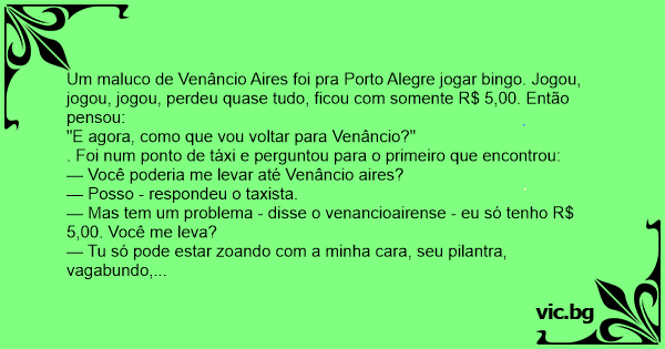 Um maluco de Venâncio Aires foi pra Porto Alegre jogar bingo. Jogou, jogou, jogou, perdeu quase tudo, ficou com somente R$ 5,00. Então pensou: