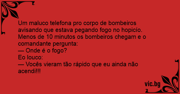 Um maluco telefona pro corpo de bombeiros avisando que estava pegando fogo no hopicío. Menos de 10 minutos os bombeiros chegam e o comandante pergunta: