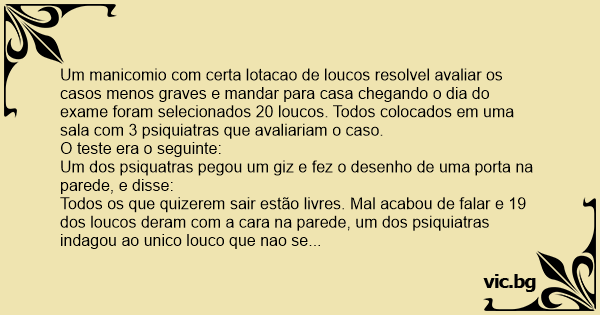Todos os que quizerem sair estão livres. Mal acabou de falar e 19 dos loucos deram com a cara na parede, um dos psiquiatras indagou ao unico louco que nao se manifestou.
