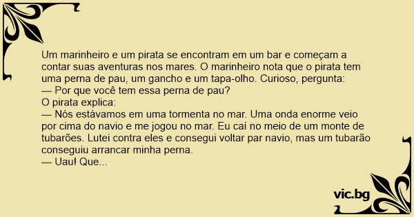 Um marinheiro e um pirata se encontram em um bar e começam a contar suas aventuras nos mares. O marinheiro nota que o pirata tem uma perna de раu, um gancho e um tapa-olho. Curioso, pergunta: