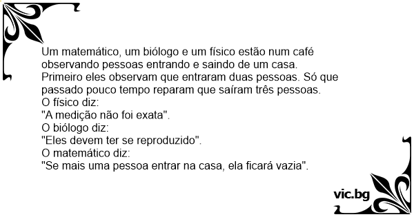 Um matemático, um biólogo e um físico estão num café observando pessoas entrando e saindo de um casa.