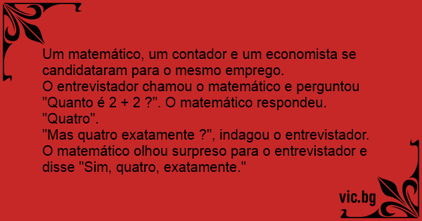 O entrevistador chamou o matemático e perguntou "Quanto é 2 + 2 ?". O matemático respondeu. "Quatro".