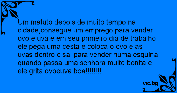 Um matuto depois de muito tempo na cidade,consegue um emprego para vender ovo e uva e em seu primeiro dia de trabalho ele pega uma cesta e coloca o ovo e as uvas dentro e sai para vender numa esquina quando passa uma senhora muito bonita e ele grita ovoeuva boa!!!!!!!!