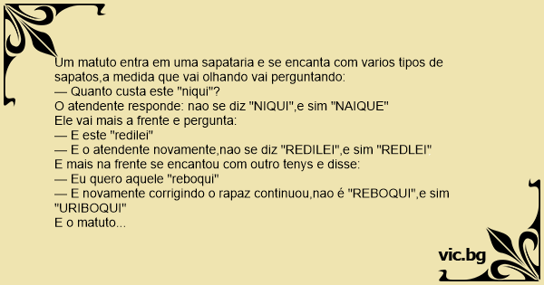 Um matuto entra em uma sapataria e se encanta com varios tipos de sapatos,a medida que vai olhando vai perguntando: