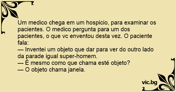 Um medico chega em um hospicio, para examinar os pacientes. O medico pergunta para um dos pacientes, o que vc enventou desta vez. O paciente fala: