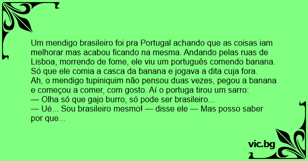 Um mendigo brasileiro foi pra Portugal achando que as coisas iam melhorar mas acabou ficando na mesma. Andando pelas ruas de Lisboa, morrendo de fome, ele viu um português comendo banana. Só que ele comia a casca da banana e jogava a dita cuja fora.