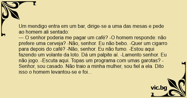 — O senhor poderia me pagar um café? -O homem responde: não prefere uma cerveja? -Não, senhor. Eu não bebo. -Quer um cigarro para depois do café? -Não, senhor. Eu não fumo. -Estou aqui fazendo um volante da loto. Dá um palpite aí. -Lamento senhor. Eu não jogo. -Escuta aqui. Topas um programa com umas garotas? -Senhor, sou casado. Não traio a minha mulher, sou fiel a ela. Dito isso o homem levantou-se e foi para casa levando o mendigo junto. Chegando em casa pediu à sua mulher que fizesse um café. A mulher então, intrigada, perguntou ao marido: