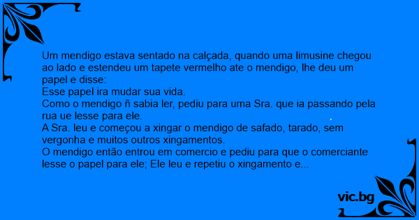 O mendigo então entrou em comercio e pediu para que o comerciante lesse o papel para ele; Ele leu e repetiu o xingamento e ainda chamou a policia, que prendeu-o imediatamente.