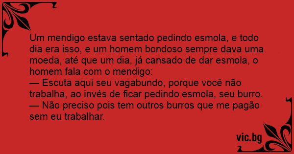 Um mendigo estava sentado pedindo esmola, e todo dia era isso, e um homem bondoso sempre dava uma moeda, até que um dia, já cansado de dar esmola, o homem fala com o mendigo: