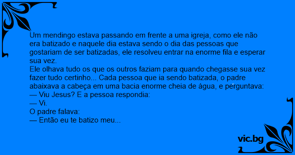 Um mendingo estava passando em frente a uma igreja, como ele não era batizado e naquele dia estava sendo o dia das pessoas que gostariam de ser batizadas, ele resolveu entrar na enorme fila e esperar sua vez.