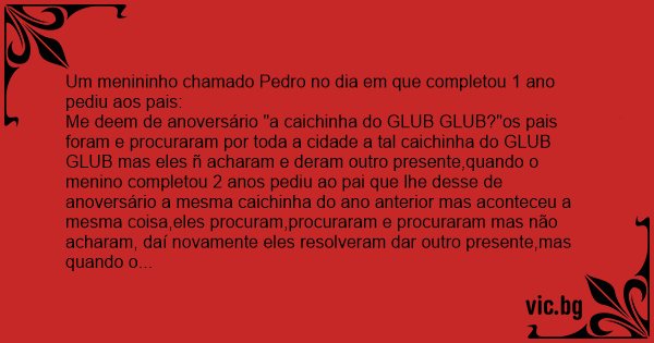 Me deem de anoversário "a caichinha do GLUB GLUB?"os pais foram e procuraram por toda a cidade a tal caichinha do GLUB GLUB mas eles ñ acharam e deram outro presente,quando o menino completou 2 anos pediu ao pai que lhe desse de anoversário a mesma caichinha do ano anterior mas aconteceu a mesma coisa,eles procuram,procuraram e procuraram mas não acharam, daí novamente eles resolveram dar outro presente,mas quando o menino completou seus 3 anos os pais ñ acreditaram,ele pediu de novo o mesmo presente,dessa vez sim!Eles procuraram em todos os cantos do mundo e ñ acharam a benedita da caichinha essa mesma história se repetiu em todos os anos mas quando o menino completou 18 anos o pai todo abobado tinha certeza que tinha comprado o presente certo para um garoto que iria completar 18 anos então mostrou o belo converssível (carro) que tinha comprado mas o menino queria aquela caichinha daí os pais procuraram e acharam o menino todo feliz largou a caixa na picina e ela fez:GLUB GLUB!