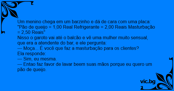 "Pão de queijo = 1,00 Real Refrigerante = 2,00 Reais Masturbação = 2,50 Reais"
