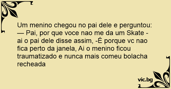 — Pai, por que voce nao me da um Skate - ai o pai dele disse assim, -É porque vc nao fiса perto da janela, Ai o menino ficou traumatizado e nunca mais comeu bolacha recheada