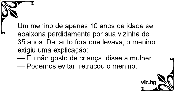 Um menino de apenas 10 anos de idade se apaixona perdidamente por sua vizinha de 35 anos. De tanto fora que levava, o menino exigiu uma explicação: