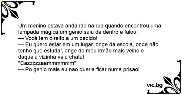 Um menino estava andando na rua quando encontrou uma lampada mágica,um gênio saiu de dentro e falou:
