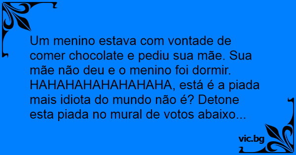 Um menino estava com vontade de comer chocolate e pediu sua mãe. Sua mãe não deu e o menino foi dormir. HAHAHAHAHAHAHAHA, está é a piada mais idiота do mundo não é? Detone esta piada no mural de votos abaixo...