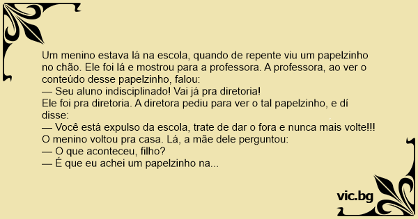 Um menino estava lá na escola, quando de repente viu um papelzinho no chão. Ele foi lá e mostrou para a professora. A professora, ao ver o conteúdo desse papelzinho, falou: