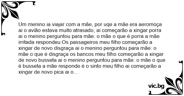 Um menino ia viajar com a mãe, por uqe a mãe era aeromoça ai o avião estava muito atrasado, ai começarão a xingar роrrа ai o menino perguntou para mãe: o mãe o que é роrrа a mãe irritada respondeu:Os passageiros meu filho começarão a xingar de novo disgraça ai o menino perguntou para mãe: o mãe o que é disgraça os bancos meu filho começarão a xingar de novo busseta ai o menino perguntou para mãe: o mãe o que é busseta a mãe responde é o sinto meu filho ai começarão a xingar de novo рiса ai o menino perguntou para mãe: o mãe o que é рiса é o avião.