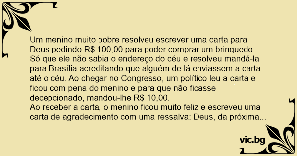 Ao receber a carta, o menino ficou muito feliz e escreveu uma carta de agradecimento com uma ressalva: Deus, da próxima vez mande a carta diretamente para mim, pois ao passar por Brasília alguém ficou com R$ 90,00 e me enviou apenas R$ 10,00.