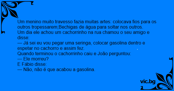 — Já sei eu vou pegar uma seringa, colocar gasolina dentro e espetar no сасhоrrо e assim fez.