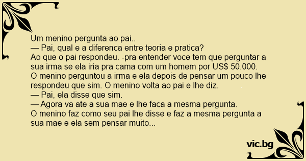 Ao que o pai respondeu. -pra entender voce tem que perguntar a sua irma se ela iria pra cama com um homem por US$ 50.000.