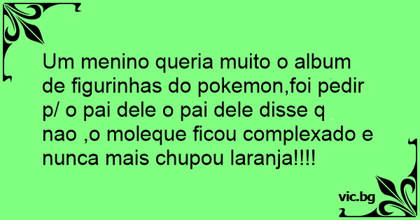 Um menino queria muito o album de figurinhas do pokemon,foi pedir p/ o pai dele o pai dele disse q nao ,o moleque ficou complexado e nunca mais chupou laranja!!!!