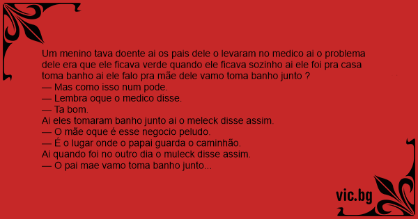 Um menino tava doente ai os pais dele o levaram no medico ai o problema dele era que ele ficava verde quando ele ficava sozinho ai ele foi pra casa toma banho ai ele falo pra mãe dele vamo toma banho junto ?