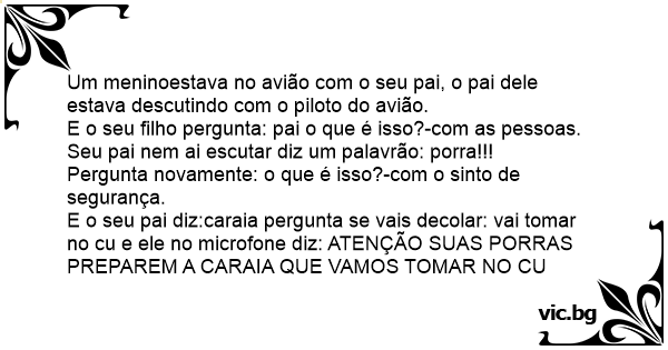 E o seu pai diz:caraia pergunta se vais decolar: vai tomar no cu e ele no microfone diz: ATENÇÃO SUAS PORRAS PREPAREM A CARAIA QUE VAMOS TOMAR NO CU