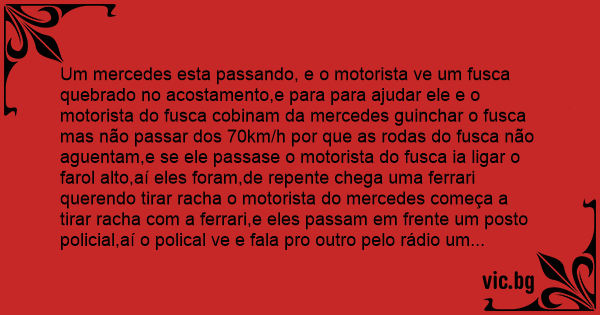 Um mercedes esta passando, e o motorista ve um fusca quebrado no acostamento,e para para ajudar ele e o motorista do fusca cobinam da mercedes guinchar o fusca mas não passar dos 70km/h por que as rodas do fusca não aguentam,e se ele passase o motorista do fusca ia ligar o farol alto,aí eles foram,de repente chega uma ferrari querendo tirar racha o motorista do mercedes começa a tirar racha com a ferrari,e eles passam em frente um posto policial,aí o polical ve e fala pro outro pelo rádio um mercedes tirando racha com uma ferrari e um fusca dando luz alta para passar.