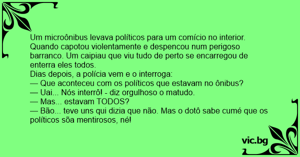 Um microônibus levava políticos para um comício no interior. Quando capotou violentamente e despencou num perigoso barranco. Um caipiau que viu tudo de perto se encarregou de enterra eles todos.