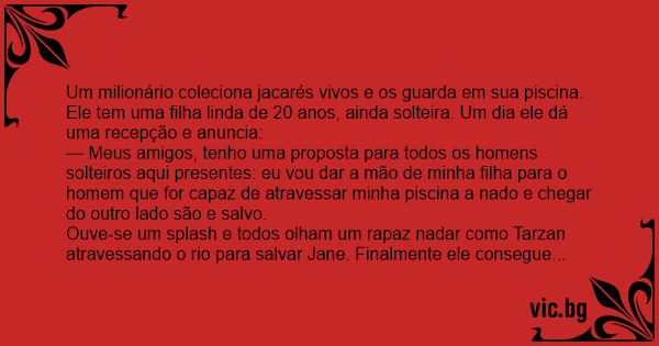 Um milionário coleciona jacarés vivos e os guarda em sua piscina. Ele tem uma filha linda de 20 anos, ainda solteira. Um dia ele dá uma recepção e anuncia:
