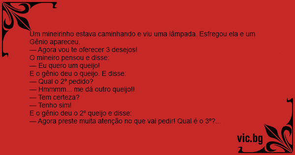 Um mineirinho estava caminhando e viu uma lâmpada. Esfregou ela e um Gênio apareceu.