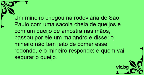Um mineiro chegou na rodoviária de São Paulo com uma sacola cheia de queijos e com um queijo de amostra nas mãos, passou por ele um malandro e disse: o mineiro não tem jeito de comer esse redondo, e o mineiro responde: e quem vai segurar o queijo.